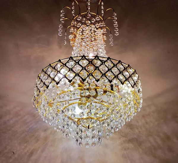 This “Big Size Jhumar” (or “Jhumar”) is defined by its substantial dimensions and an abundance of glass crystal elements. While “original crystal” implies higher-grade leaded crystal, “glass crystal” still offers significant sparkle and light refraction, making the fixture highly attractive and luminous. These crystals are typically cut into various shapes (like prisms, beads, or teardrops) and are meticulously arranged in tiers, cascades, or intricate patterns to maximize their reflective qualities.