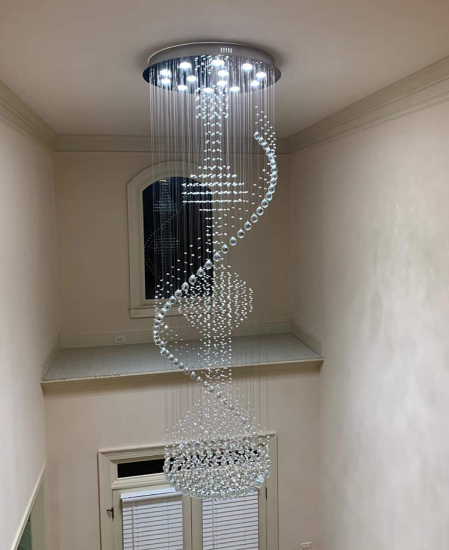 Designed for flush mount installation, the chandelier is securely attached to the ceiling, with the spiral of crystals gracefully hanging down. Its dimensions are typically substantial, suitable for duplex homes, grand entryways, or areas where a statement light fixture is desired. The ability to customize the light temperature and the sheer visual impact of its spiraling crystal design make the Spiral Modern Crystal LED Chandelier a truly luxurious and impressive lighting solution.